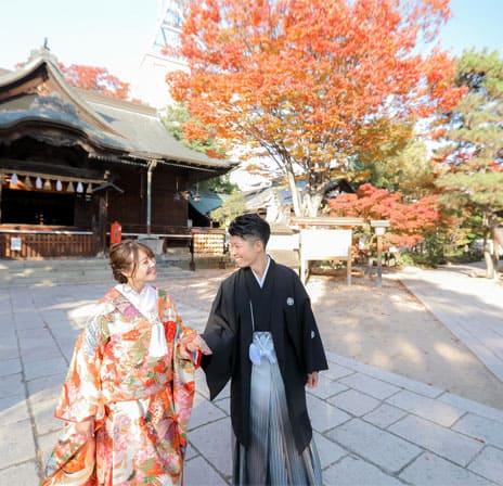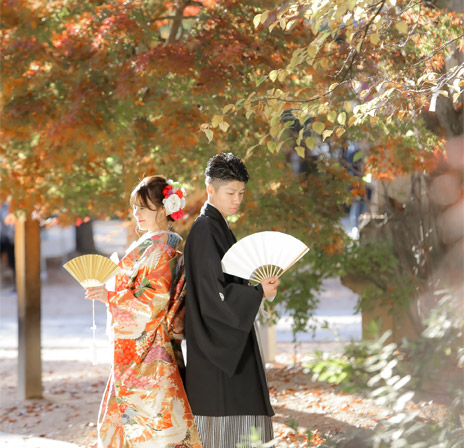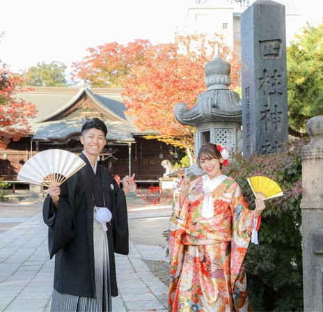 四柱神社での少人数結婚式を『衣裳』、『美容』、『写真撮影』をトータルプロデュース。お客様のお好きな会食会場をお選びください。